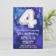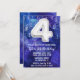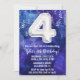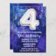 Garçon bleu blanc 4e anniversaire invitation garçons 4 anniversaire invitation pour un garçon bleu violet avec écriture de script moderne et ballon en papier amusant.