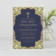 Cette élégante invitation de première communion bleu marine et or avec une atmosphère vintage, recommandée pour un garçon, comporte un cadre en faux or orné de feuilles dorées sur fond bleu marine. Au-dessus du texte, il y a une croix religieuse en faux or. Tout le texte peut être personnalisé et est d'une couleur jaune doré semblable au cadre en faux or.
