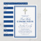 Invitation pour la première communion d'un garçon avec un fond blanc simple pouvant être changé en n'importe quelle couleur, une double bordure bleu marine, une croix religieuse argentée avec des fleurs blanches et un modèle de première communion facile à personnaliser. Le dos présente des rayures nautiques bleues et blanches, et des paillettes argentées.