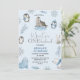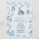 Boys Blue Arctic Winter Onederland 1er anniversaire Invitation Les garçons doux hiver onederland invitation d'anniversaire à thème mettant en vedette divers animaux arctiques sur un arrière - plan bleu clair.