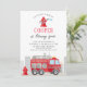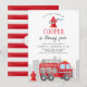 Boys Red Let's Get Fired Up Fire Engine Invitation Anniversaire Toute invitation d'anniversaire de pompier garçon d'âge comprenant un moteur d'incendie, une borne d'incendie et un paysage urbain.
