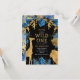 L'invitation de ce safari "sauvage" à thème de la fête de premier anniversaire du garçon comprend des animaux à fausse feuille d'or (girafe, lion et singes), du feuillage doré et bleu de la jungle, et un arrosage de confettis d'or sur un arrière - plan noir. Ajoutez le nom du garçon d'anniversaire et les détails de la fête en or et en blanc. Un cadre de coordination motif de feuilles bleu et or apparaît à l'envers.