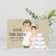 Les mariés coupant joyeusement le gâteau de mariage avec un couteau. Célébrez votre jour de mariage avec ce charmant design de Kakigori Studio.