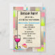 Une invitation d'anniversaire design moderne. L'arrière - plan est une illustration abstraite avec de petits et grands carrés et des rectangles avec des lignes intersectées. Ce design créatif présente des pastels contrastés et des reflets dans les couleurs crème, rose rose, vert citron, brun clair et bleu vif. Le centre a une boîte de texture parchemin avec une bordure noire, entrez les détails de votre fête personnalisée. Au fond, un verre à vin rempli de vin rouge et une tranche de gâteau. Idéal pour les fêtes d'anniversaire à base de gâteaux et de cocktails pour adultes.