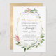 Invitation de 50e anniversaire de mariage avec verdure boisée comprenant herbes sauvages, fougères, feuilles et eucalyptus avec cadre géométrique doré personnalisable selon les spécificités de votre événement.