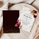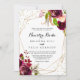 Cette faire-part de mariage carda géométrique bordeaux nuestra est parfaite pour un mariage rouge. Le design est composé de fleurs rose, rousse, rouge, bordeaux et bordeaux à aquarelle avec feuillage vert, ornant un cadre géométrique de parties scintillant d'or.