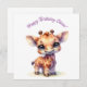 Une girafe bébé mignonne de style cartoon avec de grands yeux expressifs et un sourire joyeux. Elle se tient dans une pose ludique, l'ambiance générale est gaie et fantaisiste, parfaite pour des cadeaux pour enfants.
