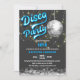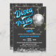 © Socialite Designs Inc. & LICENSORS. Célébrez une fête d'anniversaire disco en invitant les invités avec cette invitation amusante et rétro de fête d'anniversaire disco. Les couleurs sont argentées, blanches, bleu néon et grises. Le design incorpore une boule de disco argent et des lumières à cordes or / blanc comme arrière - plan.