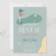 This retro modern gender reveal golf party/par-tee invitation features a blue and pink flags and golf balls with a fairway and bunker in a golf course. The reverse side features a sage green background with a golf ball and tee pattern. Personalize it for your needs. You can find matching products at my store.