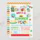 Fin de l'année scolaire Pool Invitation, programme de couleurs primaires adapté à tout âge. Pour les modifications supplémentaires (couleur de police, style de police, supprimer ou déplacer des éléments, changer d'autres termes *les mots SCHOOL et POOL ne sont pas modifiables), cliquez sur personnaliser, faites défiler vers le bas et cliquez sur le lien "Editer à l'aide de l'outil de conception".
