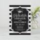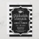 Invitation à la fête de fin d'études pour hommes ou femmes. Elégante carte invitation en noir, blanc et argent. Design simple et moderne avec des rayures, un casquette, faux parties scintillant argent et typographie script. Idéal pour une célébration élégante de remise des diplômes.