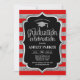 Invitation à la fête de fin d'études pour hommes ou femmes. Elégante carte invitation en rouge, noir et argent. Design simple et moderne avec des rayures, un casquette, faux parties scintillant argent et typographie script. Idéal pour une célébration élégante de remise des diplômes.