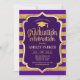 Invitation à la fête de fin d'études pour hommes ou femmes. Elégante carte invitation en violet et or. Design simple et moderne avec des rayures, un casquette, faux parties scintillant or et typographie script. Idéal pour une célébration élégante de remise des diplômes.