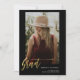 a est une conception minimale en black that fea calligraphy script in gold and a gold-framed photo on the front of the card, and a 2nd photo along with personalized information on the back