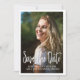 Photo de graduation Enregistrer la date / carte de faire-part formatée verticalement avec le texte du script de calligraphie. Le dos de la carte est blanc, mais la couleur est personnalisable avec l'outil de design de Zazzle. Contactez-nous pour obtenir de l'aide sur la personnalisation ou pour demander des produits correspondants.