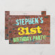 Ce design amusant d’invitation à la fête d’anniversaire comporte un message comme "31e FÊTE D’ANNIVERSAIRE DE STEPHEN!", où le nom peut être personnalisé, sur le devant. L'arrière - plan est représenté par un mur en brique composé de briques de couleur rougeâtre. Le texte de message personnalisable sur le devant présente des couleurs comme le bleu, le jaune et le vert, et il a un aspect inspiré de celui des graffitis peints. Le verso comporte un message personnalisable qui pourrait inclure des détails pertinents sur la fête d'anniversaire. Des invitations à des fêtes d'anniversaire comme celle-ci pourraient être une façon amusante pour la famille et les amis invitations d'une fête d'anniversaire organisée pour quelqu'un qui célèbre son trente et unième anniversaire. [~Z0000287]