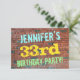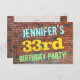 Ce design amusant d’invitation à la fête d’anniversaire comporte un message comme "JENNIFER’S 33rd BANTHDAY PARTY!", où le nom peut être personnalisé, sur le devant. L'arrière - plan est représenté par un mur en brique composé de briques de couleur rougeâtre. Le texte de message personnalisable sur le devant présente des couleurs comme le bleu, le jaune et le vert, et il a un aspect inspiré de celui des graffitis peints. Le verso comporte un message personnalisable qui pourrait inclure des détails pertinents sur la fête d'anniversaire. Des invitations à des fêtes d'anniversaire comme celle-ci pourraient être une façon amusante pour la famille et les amis invitations d'une fête d'anniversaire organisée pour quelqu'un qui célèbre son trente-troisième anniversaire. [~Z0000287]