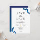 Moderne et élégant enregistrer l'invitation à la date avec une paire d'or de ciseaux et ruban bleu parfait pour les révélations de produits, de nouvelles entreprises, des fêtes de chauffage domestique et autres occasions similaires.