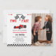 Deux voitures rapides jumeaux 2e course d'anniversaire sur les invitations de fête d'anniversaire de ces enfants mignons avec une course de voiture rouge. Thème de voiture de course mignon pour une fête de 2ème anniversaire avec l'illustration d'une voiture rouge vintage avec les mots "Growing up too fast."