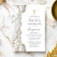 Le bord gauche de cette élégante invitation à la première communion moderne comporte une bordure d'aquarelle gris et blanc bordée d'une parties scintillant en faux or. Une fausse croix de feuille d'or apparaît au-dessus du texte personnalisable, qui combine l'écriture manuscrite, les polices cuivre et italique en gris fusain sur un arrière - plan blanc. L'envers présente un design d'agate gris et or assorti.
