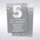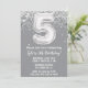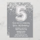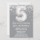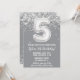 Gris et argent 5e anniversaire invitation de fête âge 5 anniversaire invitation de fête avec parties scintillant et écriture de script moderne et ballon amusant en feuille de papier.