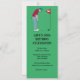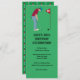 Un golfeur vert, portant un casquette, une chemise rouge et un pantalon bleu, mettant une balle de golf dans une invitation de la partie design trou. Customisez le texte.