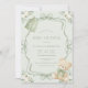 Whimsical green bow with ribbons and bows form a vintage frame for this lovely baby shower ivitation. Soft green background. Vintage teddy bear and green baby bib overalls accent the corners with white hydrangeas mixed with greens in each corner. A perfect invitation for a perfect event. Gender neutral style. 100% customer satisfaction at Zazzle every day.
