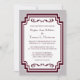 Les lignes blanches et rouges marron coupées propres du champ de texte encadré, ainsi que l'élégante conception de défilement en haut et en bas, font de cette faire-part de mariage formelle un point fort. L'élégance simple est toujours à la mode ! L'espace encadré bordeaux et blanc offre beaucoup de place pour votre texte de mariage personnalisé, qui est également en bordeaux. L'invitation est bordée de gris chaud, et l'arrière de l'invitation est également gris.