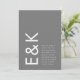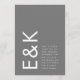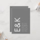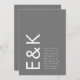 Ce superbe monogramme et emplacement de texte en Gris et Blanc, propre et bien conçu, moderne, minimal mais très ludique, pour un style minimaliste, est cependant personnalisable à d'autres couleurs et fait partie d'une suite et d'une collection uniques de Phrosne Ras Design. Ce serait génial pour ceux qui planifient un événement amusant en noir et blanc, avec ce faire-part de mariage audacieux et a été inspiré par des gens amoureux du plaisir qui aiment une bonne fête et ne se gênent pas de s'éloigner de la tradition.