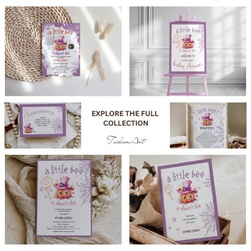 "Préparez-vous à une célébration spottaculaire ! Notre 'Little Boo is Presque Due' Halloween Baby Girl Shower Invitation est ici, avec des tons d'orange violet enchanteurs et d'adorables amis fantomatiques.