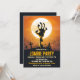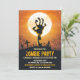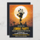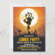 Amusez-vous à une fête zombie avec une main sortant de la tombe dans un cimetière avec un ciel orange, une pleine lune, des étoiles et des arbres.