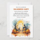Invitation de la fête d'Halloween avec une aquarelle illustrant un cimetière hanté, des jack-o-lanterns et des chauves-souris.
