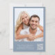 Invitation minimaliste de mariage bleu poussiéreux avec "Happily Ever After Party" dans un script blanc chic, votre invitation en typographie serif blanche classique, et vos noms dans un script signature. Au verso, téléchargez votre photo et entrez l'adresse de votre site Web mariage pour créer un code QR que vos invités peuvent scanner sur RSVP en ligne et obtenir des détails supplémentaires.