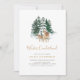 Célébrez le premier anniversaire de votre bébé avec cette invitation d’anniversaire sans distinction de sexe qui présente une illustration d’un faon et d’un cerf sur le thème de l’hiver en aquarelle devant une forêt enneigée.