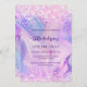 Une invitation à la fête d'anniversaire de 18e anniversaire, féminine et féminine (ou tout âge). Devant : Un arrière - plan de couleur holographique en violet, rose. Décoré de confettis rose vif. Personnalisez et ajoutez un nom et des détails du parti. Le nom est écrit avec un script de style écrit à la main, des lettres de couleur violette.