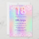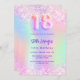 Une invitation à la fête du 18e anniversaire féminine et féminine. Devant : Un arc-en-ciel, arrière - plan de couleur holographique en violet, rose, vert menthe. Décoré de confettis rose vif. Personnalisez et ajoutez un nom et des détails du parti. Le nom est écrit avec un script de style écrit à la main, des lettres de couleur violette.