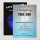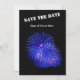 Une invitation d'anniversaire moderne que vous pouvez changer et personnaliser pour envoyer à tout âge, avec un rappel "enregistrer la date" sur le dos avec feux d'artifice bleu sur un arrière - plan noir.