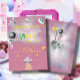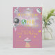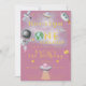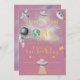Adorable invitation pour l'anniversaire de naissance avec un astronaute, des fusées, Terre & étoiles sur un arrière - plan rose foncé. Retournez notre invitation de filles mignonnes pour voir une étoile de tir de coordination. Visitez notre boutique pour toute notre gamme, y compris les cartes de tirage de tombola et de livre correspondantes.