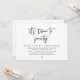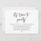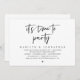 Carte d'invitation de mariage en fuite sur le thème du script moderne en noir et blanc (il est temps de faire la fête). Elle est parfaite pour votre réception de mariage en fuite / fête de célébration après le mariage. Ajoutez vos détails dans une police / lettrage noir assorti.