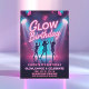 Illuminez la nuit avec cette invitation d'anniversaire Glow ! Avec une écriture rose néon, des projecteurs de scène lumineux et des silhouettes dansantes, ce design est parfait pour une fête d'anniversaire amusante sur le thème glow, danse et célébration.
