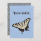 Jetez la fête parfaite ou la célébration en l'honneur d'un fan de papillons avec ces invitations avec une illustration simple mais réaliste d'un papillon à queue blanche de tigre. L'avant de l'invitation a une grande illustration de papillon contre un arrière - plan bleu ciel et votre choix de message en écriture script noir. Il y a beaucoup de place à l'arrière pour inclure tous les détails de votre fête. Juste les champs modèles pour remplir tous vos détails.