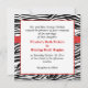 Impression zèbre noir blanc avec arc rouge et bijoux mariage invitation personnalisée qui comprend une bordure en zèbre noir et blanc et un ruban rouge avec un arc et un bijou en forme de coeur également en rouge avec contour et strass en or qui ajoute un peu de bling. Notez que l'arc et le bijou de diamant du coeur sont une illustration "imprimée sur" et non un vrai cristal, ainsi le strass. Ce design branché allie éléments modernes et tendance à la police Old English, qui lui donne une touche vintage et rétro. Un design élégant et élégant, parfait non seulement pour un mariage d'hiver.