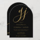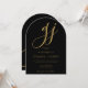 Un simple monogramme en or élégant contenant les initiales du prénom de la mariée et du marié. Un design simple dans un style moderne minimaliste sur une élégante invitation en arc de cercle, or sur noir. L'arrière de l'invitation comprend les initiales de script plus grandes, avec un style moderne saignant hors des bords. Disponible en version imprimée, en téléchargement numérique ou les deux.