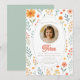 Encantadora invitación de cumpleaños florida con temática floral, con un suave borde botánico pastel, una foto centrada del chica de cumpleaños y una tipografía elegante. Ideal para celebrar un día especial con un toque cálido e inspirado en la naturaleza.