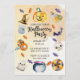 Cette invitation Halloween présente une mise en page de style aquarelle avec diverses illustrations thématiques, notamment une citrouille sculptée en haut, des bonbons, des chauves-souris, une bouteille de potion, des crânes, un fantôme, un chaudron et d'autres icônes classiques d'Halloween disposés autour de la zone de texte. La section centrale contient des informations d'événement personnalisables telles que la date, l'heure, le lieu et les informations de RSVP, le tout sur un fond clair texturé qui met en valeur l'œuvre d'art.