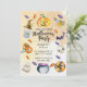 Cette invitation Halloween présente une mise en page de style aquarelle avec diverses illustrations thématiques, notamment une citrouille sculptée en haut, des morceaux de bonbons, des chauves-souris, une bouteille de potion, des crânes, un fantôme, un chaudron et d'autres icônes classiques d'Halloween disposés autour de la zone de texte. La section centrale contient des détails d'événement personnalisables tels que la date, l'heure, le lieu et les informations de RSVP, le tout sur un fond clair texturé qui met en valeur l'œuvre d'art.