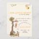 Célébrez l'arrivée imminente de votre "petit trésor" avec cette charmante invitation à une baby shower ! Avec un thème forestier fantaisiste inspiré des personnages classiques de l'enfance, ce design présente une scène ludique avec des animaux, un arbre, un ballon et une ruche en nid d'abeilles. Les tons chauds et les détails charmants créent une esthétique douce et accueillante.