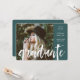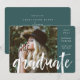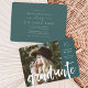 Faire-part de graduation audacieuse et moderne et invitation à la fête comprend votre photo préférée avec "diplômé" superposé à la main style maquillé typographie de brosse. Personnalisez avec le nom du diplômé, l'année de classe et l'école le long du côté droit sur une bande chic de jasper jade vert tonique bijou. Les cartes sont inversées pour révéler les détails de votre fête de remise de diplômes dans des couleurs assorties.