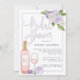 Élégante et moderne invitation à la douche nuptiale pour les amateurs de vin avec des accents de roses en blanc, lavande et lilas avec un regard verdoyant sur la verdure, et une bouteille et un verre de vin rosé. Personnalisez avec vos détails de douche nuptiale dans une élégante typographie blush et gris-bleu accentuée de calligraphie de style manuscrit, et customisez la bouteille de vin avec les initiales du couple. Cartes inversées à lavande et rayures blanches.