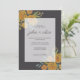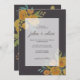 Invitation de mariage classique et élégante conçue avec des roses et des pivoines jaunes, feuilles botaniques et eucalyptus dans un arrière - plan brun foncé. Écrivez les détails de votre mariage dans des polices serif propres.